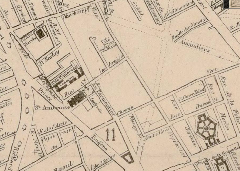 La vaste cité ouvrière est peut-être la cité Saint-Maur, que l’on voit sur le plan en couverture de cet article. Le ciseleur B… offre aux fugitifs une de ses deux pièces.