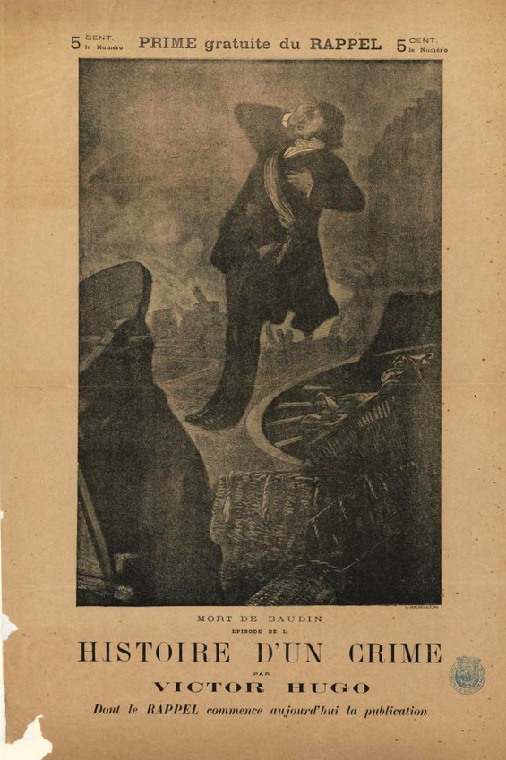 Je ne sais pas qui est l’auteur du dessin (à mon goût, pas très réussi), publié en publicité de la publication d’Histoire d’un crime dans Le Rappel (en 1877, je suppose). J’ai trouvé ce dessin au Musée Carnavalet.