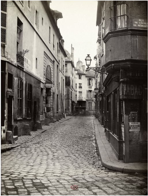 Il se trouve que Charles Marville a précisément photographié l’emplacement de la Marmite. La photographie de couverture montre bien le 8, rue Larrey. En voici un agrandissement d’un détail.