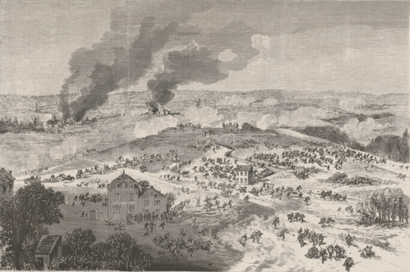 Le 4 avril, à 5 heures, le plateau et les villages voisins sont enveloppés par la brigade Derroya [Derroja] et la division Pellé : « Rendez-vous, vous aurez la vie sauve », fait dire le général Pellé. Les fédérés se rendent. Aussitôt les Versaillais saisissent les soldats qui combattaient dans les rangs fédérés et les fusillent. Les autres prisonniers, enfermés entre deux haies de chasseurs, sont acheminés sur Versailles. Leurs officiers, tête nue, les galons arrachés, marchent en tête du convoi.