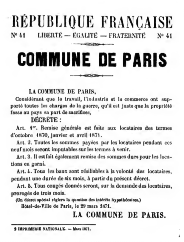 On distingue souvent les « mesures de circonstance », que l’assemblée communaliste prend pour répondre aux grandes difficultés que connaissent de très nombreux Parisiens. Dans cette situation, la question des loyers, qui grevaient les budgets populaires, est centrale. Faisant fi de la misère parisienne, l’Assemblée nationale avait envisagé en mars de mettre fin au moratoire des loyers accordé pendant la guerre. Après le 18 mars, le Comité central de la Garde nationale avait interdit toute expulsion de locataires. A sa suite, dès le 29 mars, la Commune, « considérant que le travail, l’industrie et le commerce ont supporté toutes les charges de la guerre, qu’il est juste que la propriété fasse sa part de sacrifices », décrète la remise générale aux locataires des termes d’octobre 1870, janvier et avril 1871. Toutes les sommes payées par les locataires pendant les 9 mois, déjà versées, seront imputables sur les termes à venir. Par ailleurs, durant le printemps, les mairies doivent faire face à des demandes d’abri, venues en particulier des habitants des zones bombardées par l’armée versaillaise. Le décret du 24 avril prévoit donc la réquisition des logements vacants, abandonnés par ceux qui ont fui la capitale depuis le 18 mars, accompagnée d’un état des lieux dont copie doit être donnée aux représentants des possesseurs. Cette mesure s’inscrit pour partie dans le prolongement des réquisitions de logements envisagées au moment du siège. Elle est conçue comme une sanction contre les « francs-fileurs » qui ont déserté le Paris de la révolution. On a, de plus, peu de renseignements concrets sur son étendue. Il n’en reste pas moins qu’elle est également pensée pour mettre les logements abandonnés « à la disposition des nécessiteux » et des gardes nationaux sans logis. Des élus de la Commune comme Arthur Arnould considèrent cependant qu’il aurait fallu apporter un « correctif » au décret du 29 mars, pour que tous ceux qui n’avaient pas eu à souffrir du siège et s’étaient même enrichis soient tenus de verser le montant de leurs loyers dans les caisses municipales. Cela aurait pu apporter une rentrée d’argent importante et aurait surtout permis de réaliser pleinement l’objectif d’équité et de justice sociale. Il ne faut donc pas minorer l’importance de la réflexion autour de ces deux décrets au prétexte qu’ils sont des mesures liées aux circonstances, comme celles qui ont été prises pendant la guerre.