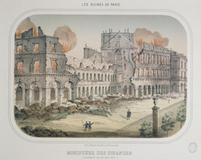 Le ministère des finances rue de Rivoli a bien brûlé en mai 1871, comme l’a expliqué Jourde au procès, à cause des obus versaillais et de la grande quantité de papier qui y était conservée. Et comme le montre l’image de couverture, que j’ai trouvée au musée Carnavalet.