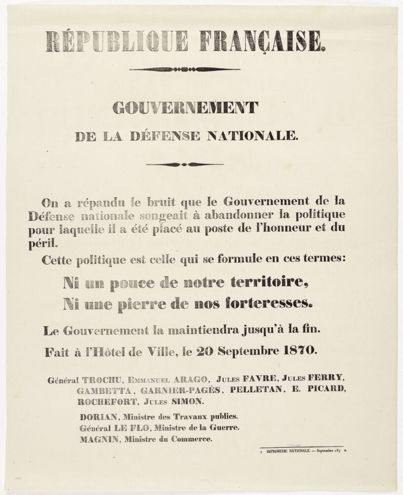 Mardi matin, 21 septembre, une affiche gouvernementale, réponse évidente aux demandes des officiers, réfutait de prétendus reproches de capitulation lancés contre la commission de l’Hôtel de Ville.