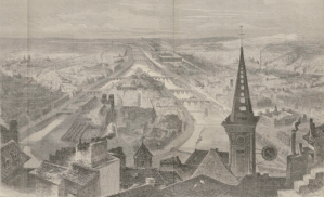 Comme elles et ils le feront sans doute, je me suis longuement arrêtée à regarder la vue aérienne du centre de Paris qui occupe les pages 10 et 11 du livre. Bien sûr, ce n’est pas une vue d’avion! Cela s’appelait d’ailleurs une vue « à vol d’oiseau ». On y voit de droite à gauche la colonne du Châtelet, le Louvre et les Tuileries, au loin l’Arc de triomphe, le dôme des Invalides, les églises Saint-Germain-des-Prés, Saint-Sulpice et Saint-Séverin, plusieurs cheminées d’usines, on y devine aussi l’activité sur la Seine, le long du quai de la Mégisserie certainement des mégissiers… Raphaël utilise cette belle image pour illustrer le moment de mars 1871 où le Comité central de la garde nationale fait la révolution… en organisant des élections. L’image, qu’il a choisie et recadrée pour le livre, est bien plus ancienne. Elle date même d’avant 1854 puisque le pont d’Arcole est encore un pont suspendu, puisque les bâtiments de l’Hôtel-Dieu sont encore du côté de la rive gauche et puisque bien des petites rues de la Cité subsistent.