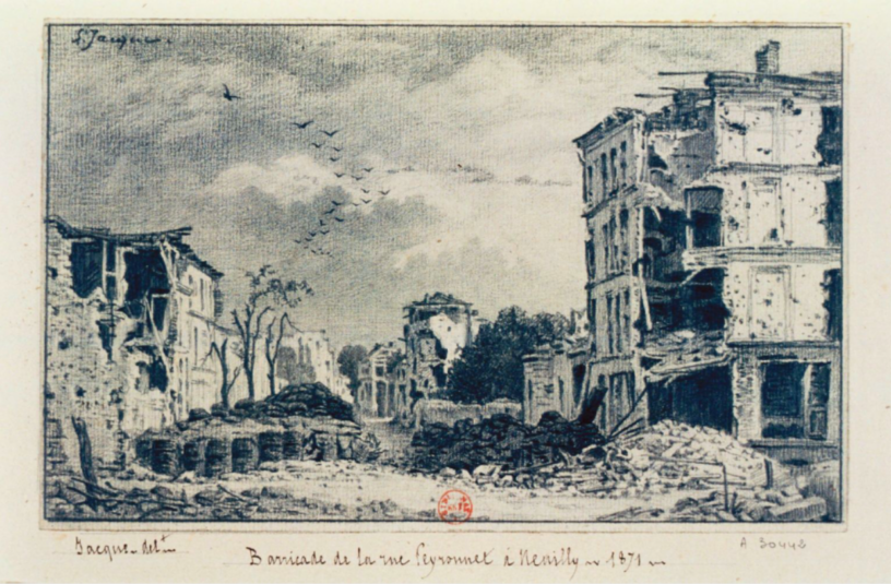 Le dessin à la mine de plomb de la barricade de la rue Peyronnet, à Neuilly, en 1871, est dû à Léon Jacque. Je l’ai trouvé sur Gallica, là.
