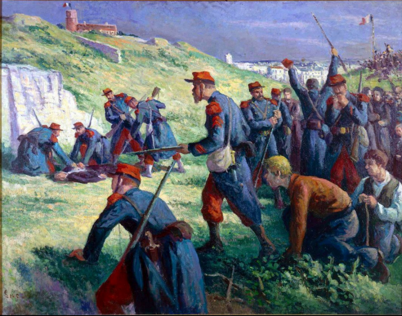 Acte 1. 18 mars. 3 heures du matin. Thiers a envoyé la troupe s’emparer des canons de la Garde nationale. Notamment à Montmartre. On a oublié deux choses essentielles: nourrir les soldats et prévoir des attelages pour emmener les canons. Le deuxième oubli fait que ça traîne. De sorte que la population a bien le temps de se trouver sur place et de défendre ses canons. C’est l’historien Louis Fiaux qui raconte — nous sommes à Montmartre, avec le 88e de ligne et son général, Lecomte: