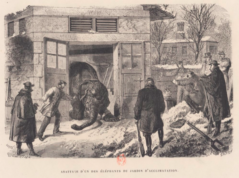 1. Il n’est pas vrai que « on avait tellement faim pendant le siège de Paris qu’on a même mangé les éléphants ». Une terrible famine, certes, comme le dit (en espérant, sait-on jamais, que ceci aura été changé quand vous lirez le présent article) le site du Jardin d’acclimatation. Mais, « faute d’aliments ordinaires on se résout à sacrifier les quelques animaux exotiques encore présents au Jardin d’acclimatation », comme le dit le même site, c’est légèrement biaisé. Ceux qui ont mangé de l’éléphant pendant le siège de Paris ne sont pas ceux qui souffraient de la famine. Vous avez vu le prix de la viande d’éléphant? Le boucher (il s’appelait Deboos) a payé 27.000 francs pour les deux bêtes. Vous croyez qu’il les a découpées pour en donner les morceaux aux femmes qui faisaient la queue aux boucheries municipales? Non, il les a vendues aux bourgeois de son quartier (la boucherie était située 123 boulevard Haussmann, dans le bon huitième arrondissement). Reportez vous à mon article du 20 décembre pour les boucheries de Belleville…