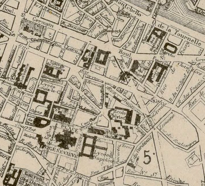 Marie part à la recherche de son mari. Rue Clovis, place du Panthéon, bibliothèque Sainte-Geneviève, son regard fouillant les tas de corps fusillés, devant la mairie, les portes cochères de la rue Soufflot, la fontaine Médicis, elle rentre chez elle par la rue de la Montagne-Sainte-Geneviève. Voir le plan ci-dessus, extrait de toujours le même plan de Paris