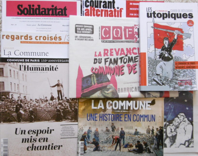 Enfin, l’illustration de couverture montre un certain nombre de journaux. De plusieurs j’ai déjà parlé, j’ai collaboré à tous — dans le cas du fort volume des Utopiques par le « vieil » article de ce site sur la guillotine, dans d’autres par des articles sur les femmes (évidemment, je suis une femme!), la Semaine sanglante (dans le hors-série de L’Humanité, évidemment, j’ai écrit un livre sur la Semaine sanglante), ou mes relations d’écrivaine avec la Commune (dans Solidaritat et dans Regards croisés — de la FSU –, évidemment, j’ai écrit un roman). Merci à tous ces journaux de m’avoir donné l’occasion de m’exprimer.
