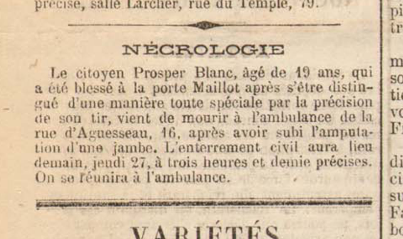 Le citoyen Prosper Blanc, âgé de 19 ans, qui a été blessé à la Porte Maillot après s’être distingué d’une manière toute spéciale par la précision de son tir, vient de mourir à l’ambulance de la rue d’Aguesseau, 16, après avoir subi l’amputation d’une jambe. L’enterrement civil aura lieu demain, jeudi 27, à trois heures et demie précises. On se réunira à l’ambulance.
