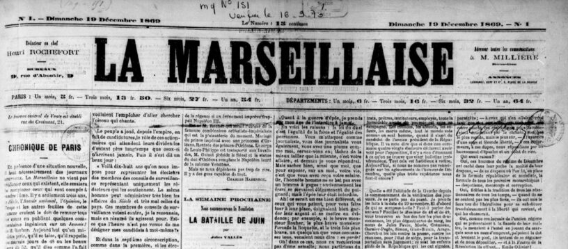 Comme annoncé dans les articles 1 (automne 1869), 2 (Rochefort), 3 (Varlin), 4 (les journalistes et la Commune) et comme présenté dans l’article 0 (Demain), voici la Marseillaise, quotidien, quotidiennement.