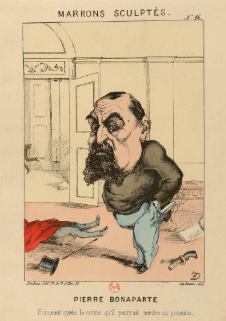 Pierre Bonaparte songe, après le crime, qu’il pourrait perdre sa pension, c’est ce qu’a représenté Duclaux pour notre image de couverture, que j’ai trouvée sur Gallica, là.