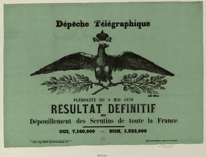 Je n’ai pas résisté au plaisir de vous annoncer, avec quelques jours d’avance, le résultat (global) du plébiscite, j’ai trouvé cette triomphante dépêche sur Gallica, là.