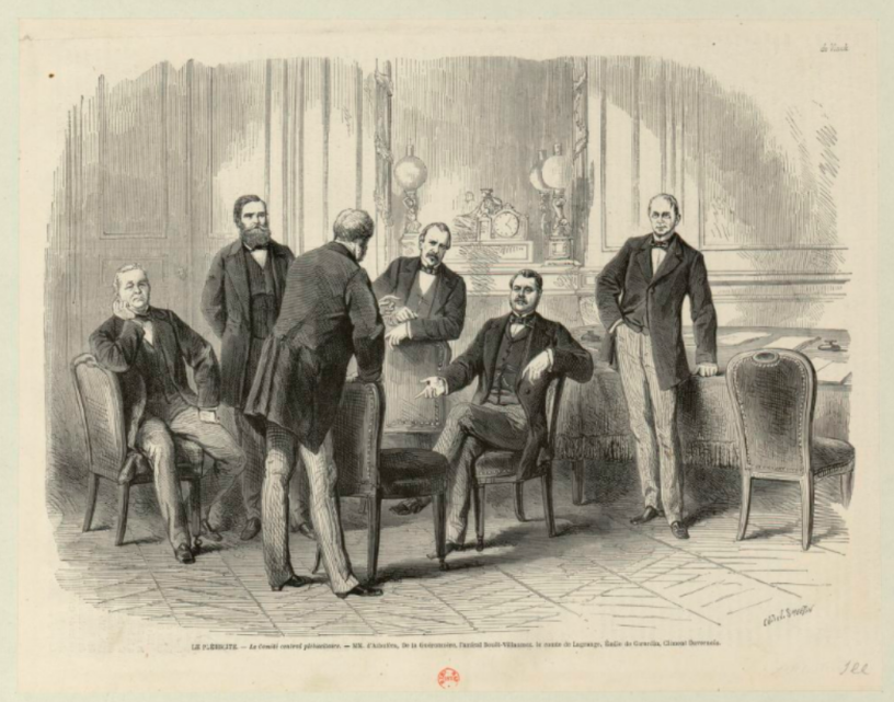 L’image de couverture représente le Comité central plébiscitaire, la droite bonapartiste, en les personnes de MM. d’Albuféra, de la Guéronnière, Bouët-Villaumez (un amiral), de Lagrange (un comte), et les journalistes Émile de Girardin et Clément Duvernois (qui devait regretter de ne pas s’appeler Du Vernois). Jean-Pierre Bonnet me propose l’identification suivante, de gauche à droite et de face, Bouët-Villaumez, Duvernois, de la Guéronière, d’Albuféra, Girardin, et de dos Lagrange. J’ai trouvé cette estampe sur Gallica, là