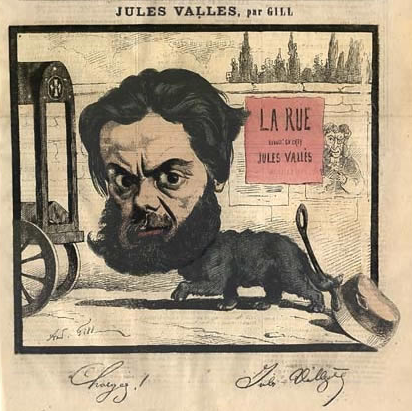 Le Vallès en chien derrière un corbillard a été dessiné par André Gill, qui en a fait la une de La Lune, le 11 juillet 1867 — c’était aussi une publicité pour La Rue. On le trouve sur le site des amis de Jules Vallès, ce qui est bien naturel!