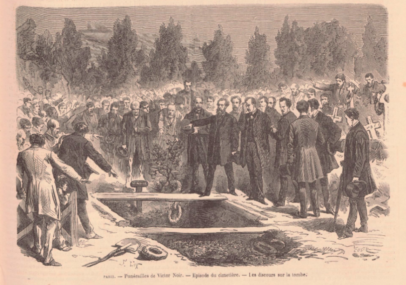 Louis Noir, élevé sur les épaules de quatre hommes, supplie le peuple de conserver le calme qu’il a montré jusqu’à ce moment, et de laisser aller le cadavre à la fosse provisoire qui lui est assignée.