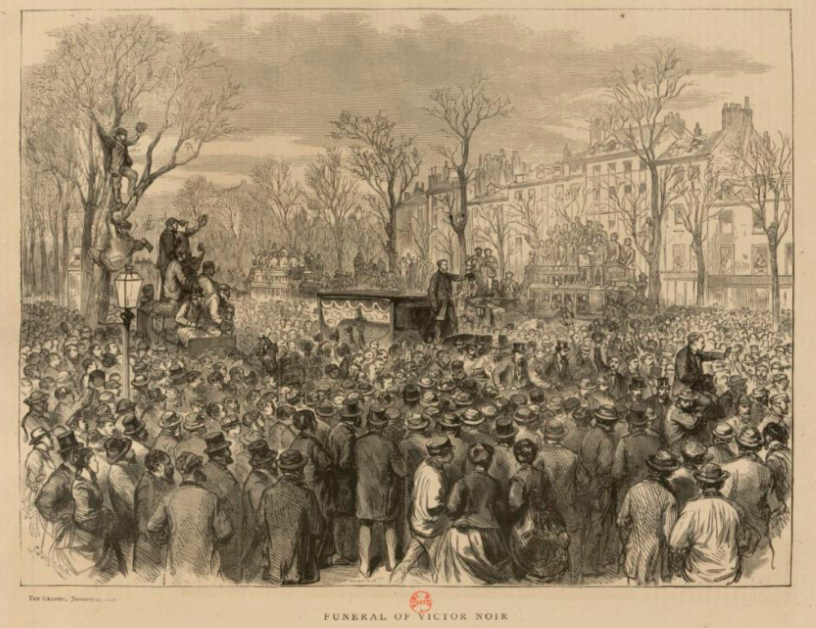 L’image d’aujourd’hui de l’enterrement de Victor Noir vient du Graphic, toujours par Gallica, ici. Apparemment, le dessinateur anglais a réussi à apercevoir quelques-unes des femmes présentes.
