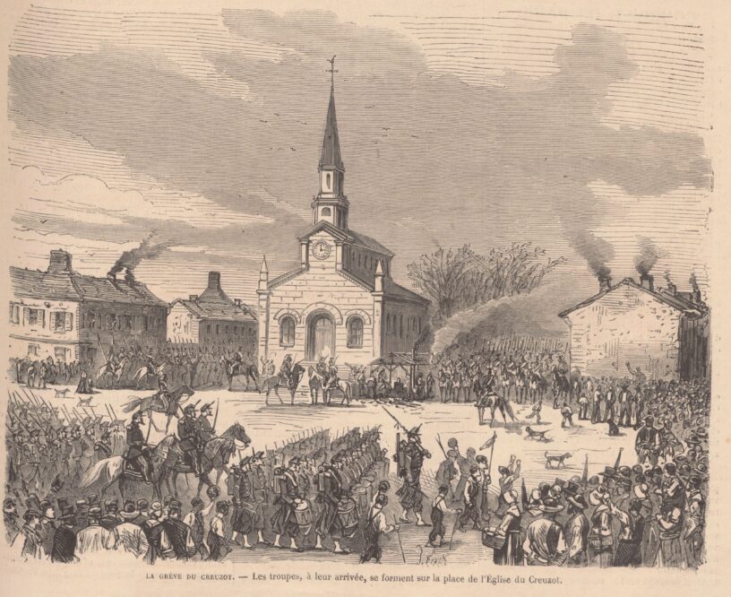 Faire grève est chose terrible ; pour un mot, pour rien, on fusille et l’on assomme ; les ouvriers du Creuzot, 12,000 hommes, organisent le refus du travail, assument la responsabilité de la faim et de la misère, et cela, en silence, sans tumulte, sans bruit, sans émeute.