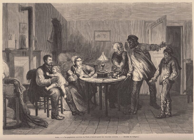 Des mauvais conseils, certainement, ceux que donne aux ouvriers l’Association internationale des travailleurs! Si l’on en croit le Monde illustré du 19 février 1870, les ouvriers ne les écoutent pas… l’image n’est pas en couverture mais en page 8.