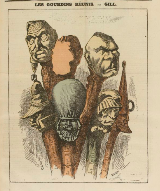 Les gourdins de l’image de couverture, caricatures de journalistes et politiciens réactionnaires, sont parus à la une de L’Éclipse, d’André Gill, le 20 février 1870, on les trouve sur Gallica, là.