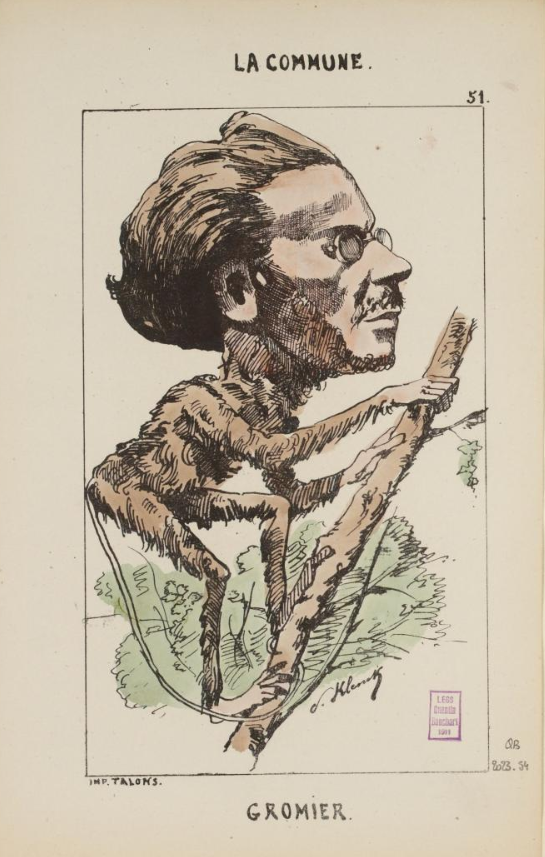 La caricature de Marc Amédée Gromier par Klenck vient du musée Carnavalet, via cette page, là.