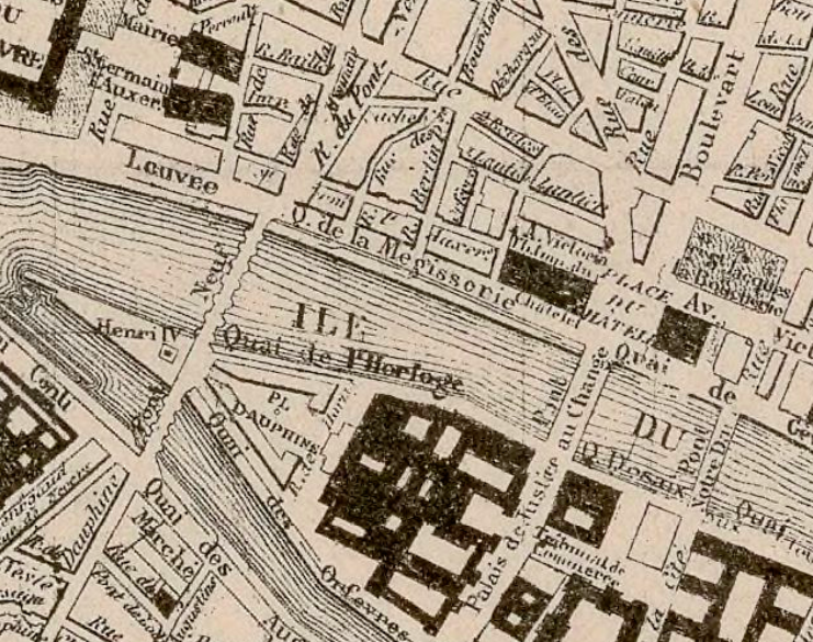 L’image de couverture, toujours issue du même plan de Paris, montre le quai de la Mégisserie: s’il y a un quai de la Mégisserie, c’est qu’il y a eu des mégissiers… spécialistes du travail des peaux fines, agneau, notamment, destinées à fabriquer les gants dont le siècle était friand.