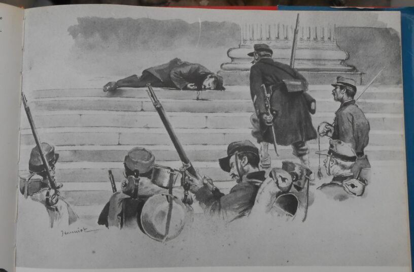 J’avais choisi l’autre parce qu’on y voit les exécuteurs de près et surtout parce qu’elle raconte l’histoire, « après ». L’image avait été recadrée, tronquée, la signature de l’artiste avait pratiquement disparu. La version que je mets en couverture, aujourd’hui (2 août 2016), je l’ai photographiée dans le livre Paris au Front d’insurgé. La signature a été reconnue par Jean-Pierre Bonnet comme comme celle de Pierre Georges Jeanniot, un artiste qui a innombrablement peint, dessiné, gravé, illustré. Malheureusement, malgré un sous-titre encourageant (la Commune en images) et une très riche iconographie, ce livre ne contient pas de nom d’auteur ni de source. On trouve aussi cette image dans le petit livre Sur les traces des communards, sans plus d’information. Pour le moment, je ne connais donc ni la date de cette image, ni le livre (ou journal) dans lequel elle est parue.