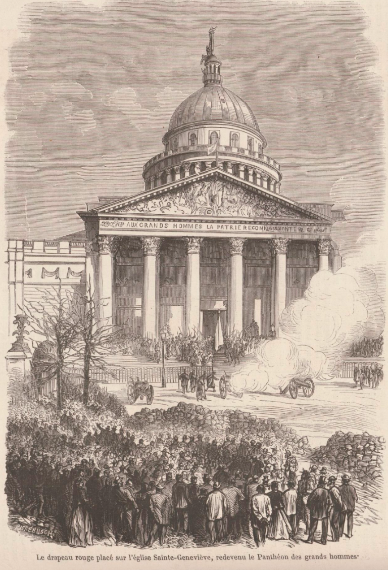Simultanément (31 mars), il est hissé au sommet de la coupole du Panthéon (on a commencé par couper les bras de la croix pour en faire une hampe, l’illustration montre la suite de l’installation du drapeau, je renvoie à un article qui raconte cette histoire) (La Patrie, 2 avril).
