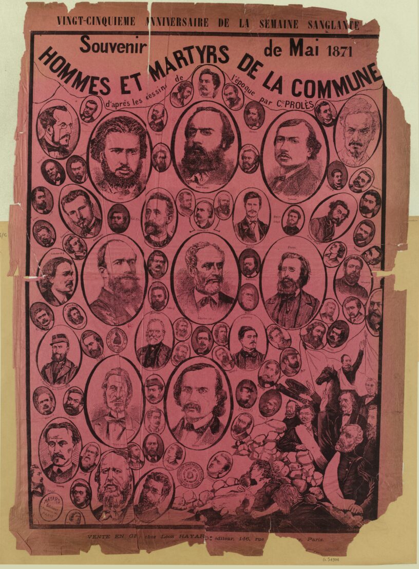 À l’occasion du vingt-cinquième anniversaire de la Semaine sanglante; Hommes et Martyrs de la Commune, 80 portraits d’après des dessins de l’époque, par Charles Prolès, auteur des cartes historiques de la Commune. — Prix du placard: 0 fr. 10. Pour la vente en gros, s’adresser chez Hayard, éditeur, 146. rue Montmartre. Pour recevoir un exemplaire franco, envoyer 0 fr. 20 en timbres-poste à la même adresse.