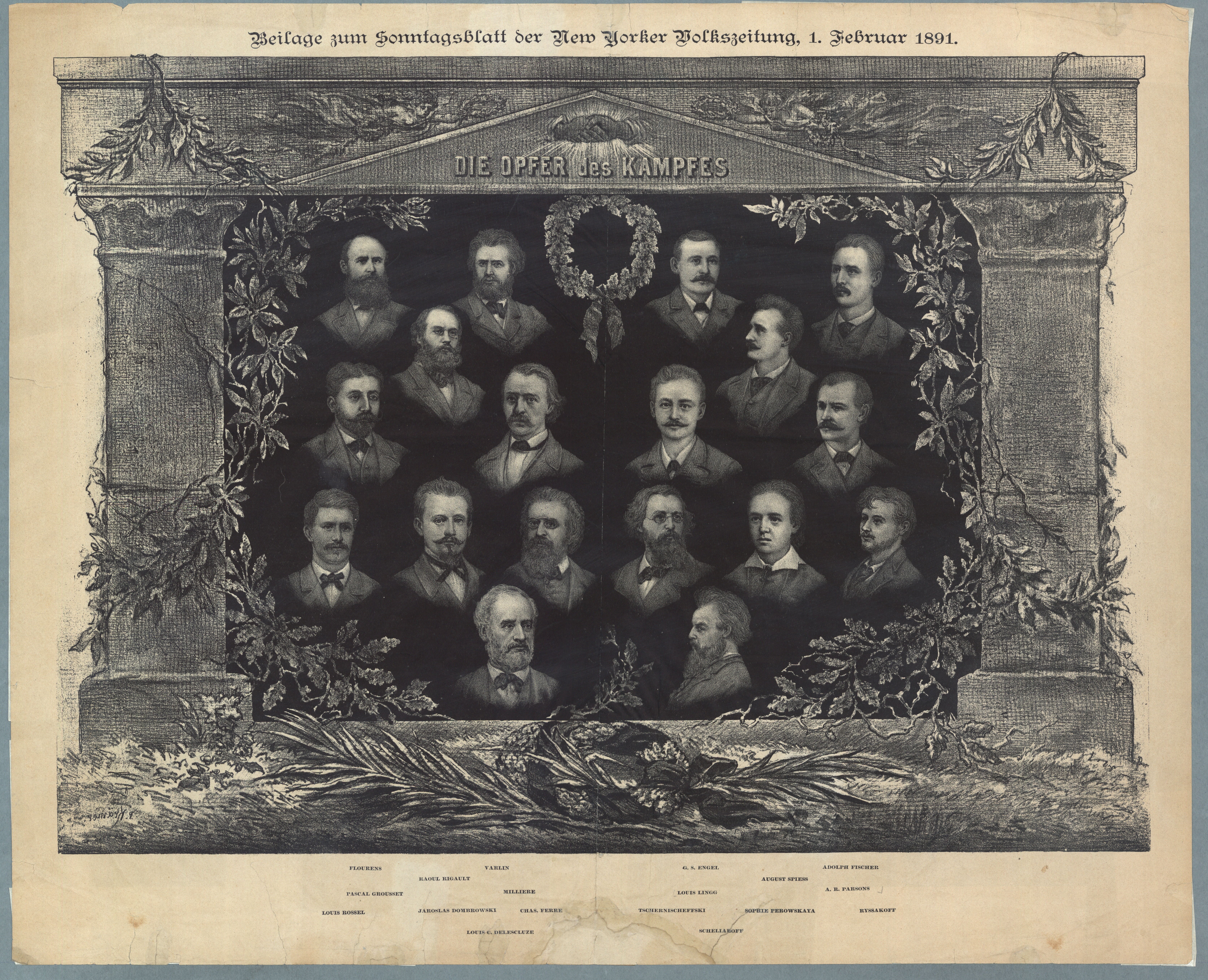 Le titre est en allemand Die Opfer des Kampfes (les victimes du combat), le journal qui offrit cette image à ses lecteurs était germanophone, se nommait New Yorker Volkszeitung et paraissait à New York. L’image est datée (1er février 1891). La partie gauche représente des Français, communards, la partie droite des Russes et des Allemands. J’attire votre attention sur le fait remarquable que cette image comporte une femme, Sophie Petrowskaya — que je n’ai pas identifiée. Les noms des « victimes » figurent sous l’image (n’hésitez pas à cliquer sur l’image pour la grossir). Du côté français, nous voyons donc, de gauche à droite et de haut en bas