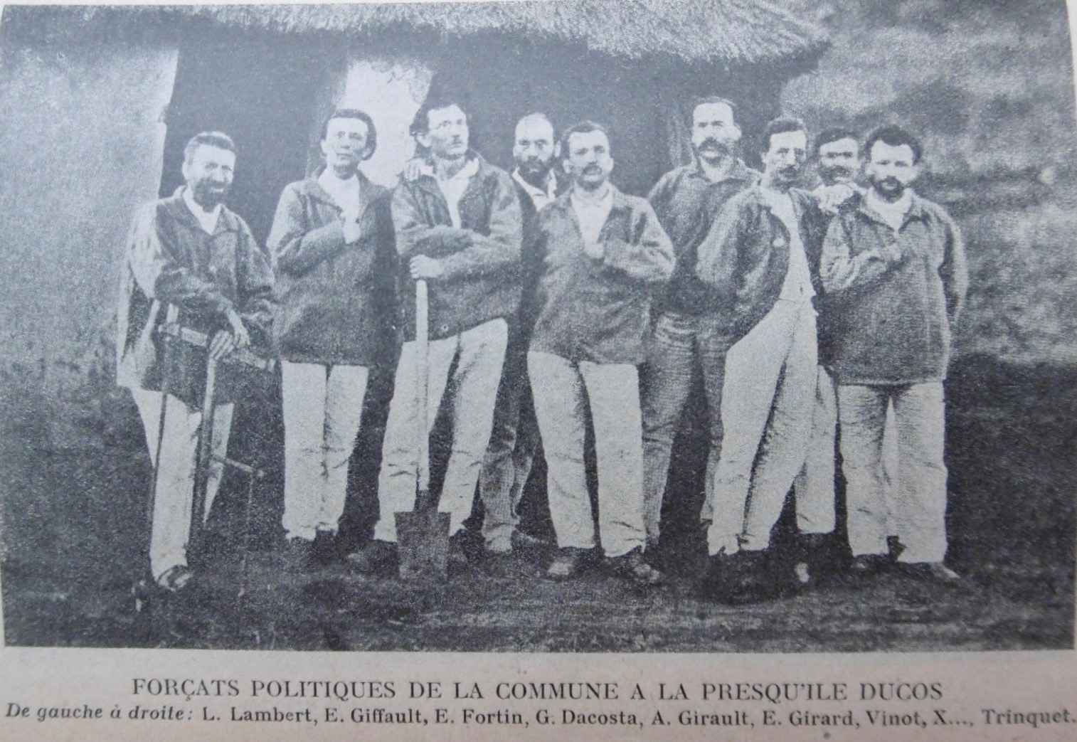 Je l’ai photographiée (d’où l’absence de qualité) dans un (vieux) livre. La légende est erronée quant au lieu, car le bagne de la Nouvelle-Calédonie était à l’île Nou et pas à la presqu’île Ducos. Les forçats sont identifiés comme, de gauche à droite,