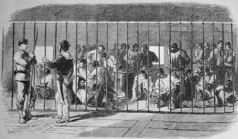 Dans le faux-pont, comme ailleurs, les détenus s’amusaient à divers jeux ou dormaient. Ils sont vêtus pour la plupart de leurs uniformes de la garde nationale, et les effets qu’ils possèdent sont pliés sur une petite planche le long du bord.