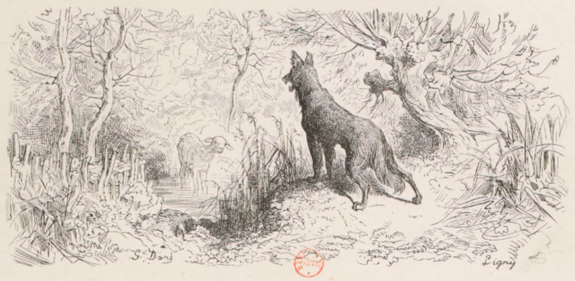 Le loup et l’agneau ont été dessinés en 1868 par Gustave Doré, mais pas pour illustrer cette brillantissime défense. N’empêche, ils y font très bien. Je les ai copiés sur Gallica, là.