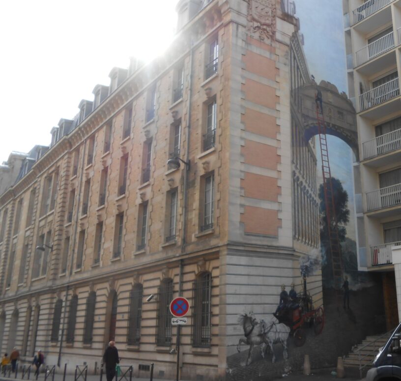 Tout en bas de cette rue sinistrée, en arrivant au métro Saint-Fargeau, il y a quand même une assez belle chose. Éphémère. Sans rapport avec la Commune. Je l’ai photographiée plusieurs fois et, chaque fois, j’ai eu des commentaires des passants qui, clairement, sont fiers qu’on vienne la photographier. Par amour pour les quartiers populaires et respect pour les rues déshéritées, j’ai utilisé une de ces photos pour en faire la couverture de cet article. Rue Haxo, un pompier monte sur sa grande échelle pour sauver un chat coincé sur… le pont des Soupirs. Voici un détail.