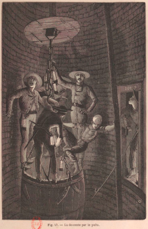 La benne s’arrête sur un plafond, au-dessous duquel le puits continue encore et constitue ce qu’on appelle le puisard ou réservoir d’eau, à ce que me dit l’ingénieur que je n’écoute guère.