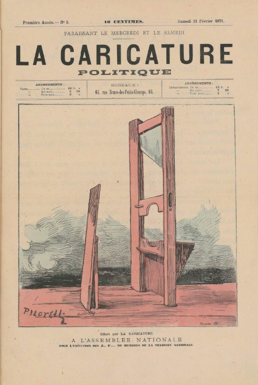 Et Pilotell a représenté une guillotine rouge [c’était le 11 février, et c’est notre image de couverture] « offerte par La Caricature à l’Assemblée, pour l’exécution des jean-foutres de membres de la trahison nationale. » [comme on le voit, il y avait « J… F… », qui pouvait bien désigner un jean-foutre particulier (Jules Favre)]