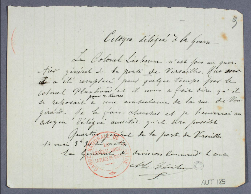 Du 12 au 21 mai, jour de l’entrée des versaillais, la défense des remparts de Vanves à Auteuil a été une œuvre presque impossible. [Le musée Carnavalet conserve une lettre datée du 14 mai, adressée par Napoléon La Cécilia au délégué à la guerre (Charles Delescluze, à cette date) que j’utilise en couverture de cet article. À 3h30 du matin, La Cécilia signalait que Maxime Lisbonne était allé se reposer deux heures dans une ambulance rue de Vaugirard et qu’il l’enverrait au délégué dès que possible. Rude période !]