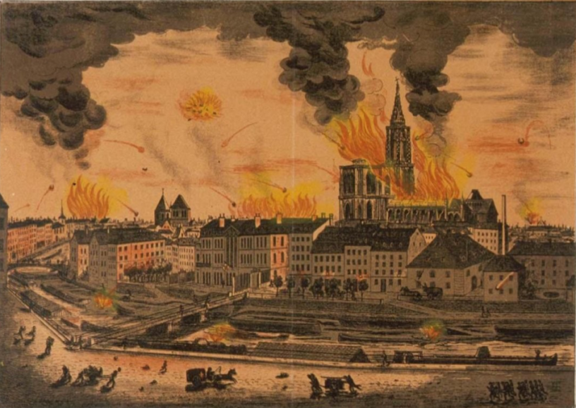 L’image du bombardement de Strasbourg est conservée à la Bibliothèque nationale universitaire de Strasbourg, on la trouve sur Gallica, là.