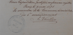 Eugène Varlin est aussi élu du sixième arrondissement et comme tel officier d’état civil. On le voit célébrer des mariages (voir, toujours, le livre cité), il a aussi signé des extraits d’actes, la BhVP conserve ainsi un extrait d’acte de décès délivré le 3 mai pour un journalier décédé rue Jacob le 5 octobre 1870, au bas duquel Eugène Varlin a écrit sa signature.