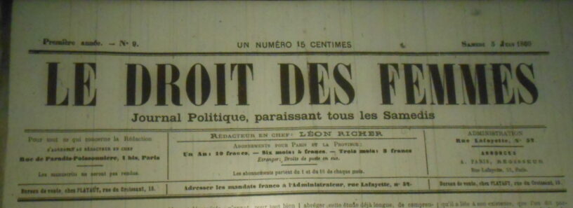 Le Droit des femmes est un hebdomadaire. Il paraît du 10 avril au 9 octobre 1869. Il est alors suspendu, mais revient avec un autre éditeur dès le 6 novembre. Il dure tant bien que mal jusqu’à la guerre (de 1870)…