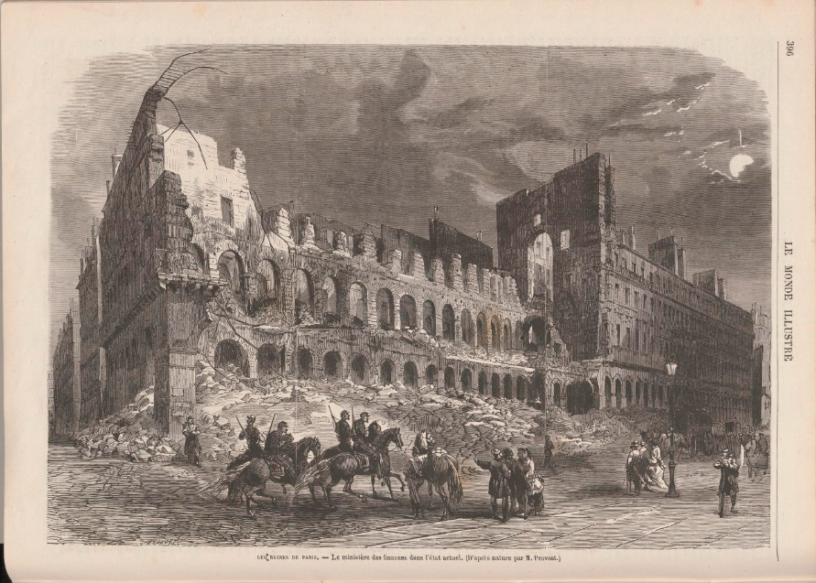 Et, bien entendu, je n’ai pas de portrait ni de Victorine ni de personne de sa famille. La couverture représente donc le ministère des finances en flammes et je l’ai trouvée dans Le Monde illustré du 24 juin 1871.