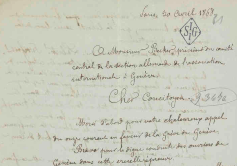 La date de la lettre, 30 avril 1868, la place au centre d’une actualité genevoise et parisienne importante. D’une part les ouvriers du bâtiment genevois sont en grève, et les internationalistes parisiens les soutiennent depuis mars.
