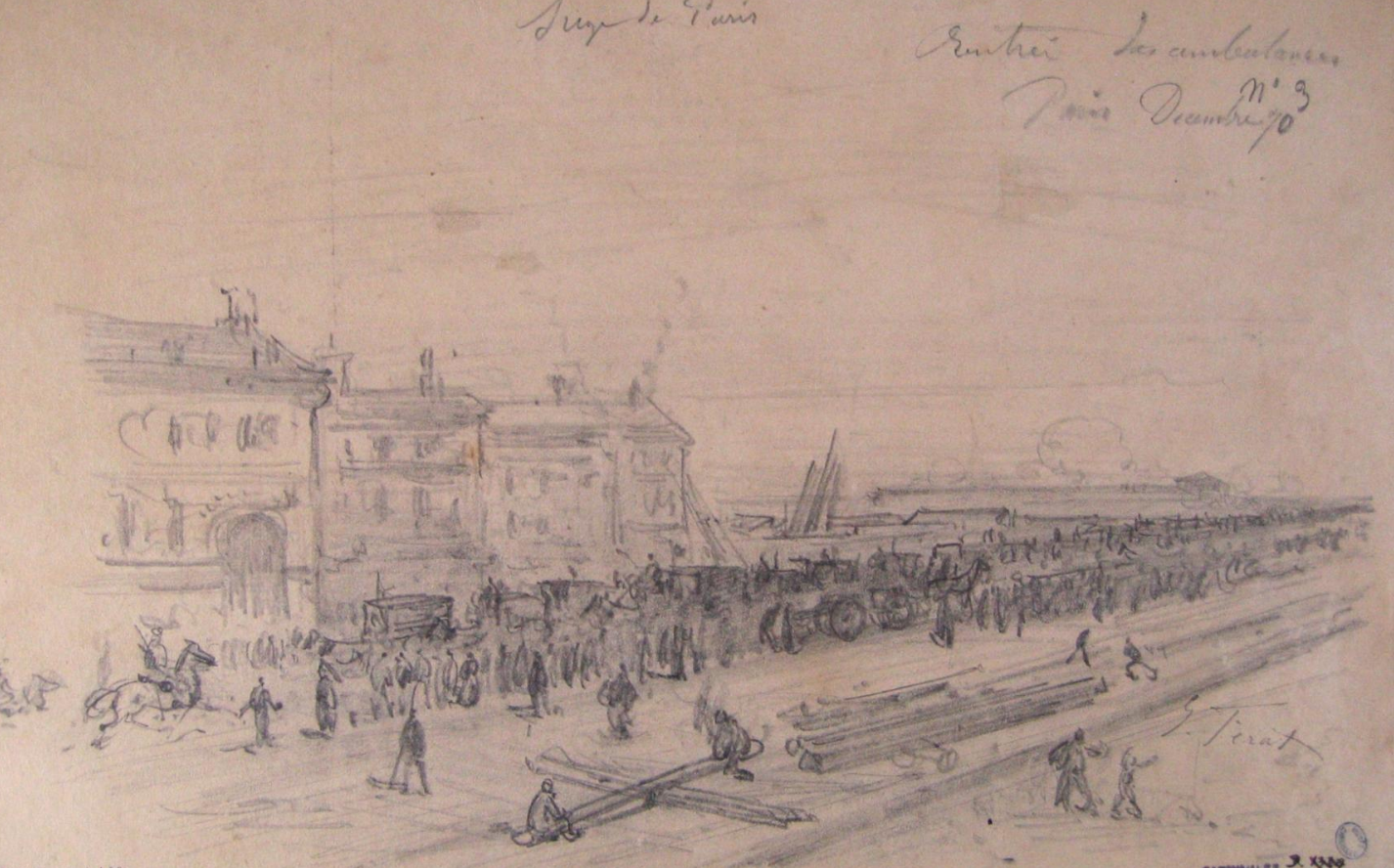 ou aller la voir sur le site du musée Carnavalet, où je l’ai trouvée, est due à Jules Ferat et, même si je n’ai pas bien compris où se passe cette scène, elle semble porter le titre « Entrée des ambulances », ce qui la rend adéquate à illustrer cet article même si elle est datée de décembre!