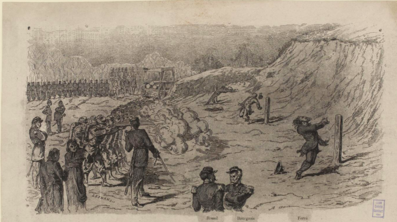 En couverture, une image peu commune de l’exécution de Satory le 28 novembre, merci à la Commission des grâces et à l’Assemblée nationale. Elle est dessinée par J. Lefman et je l’ai trouvée au Musée Carnavalet.